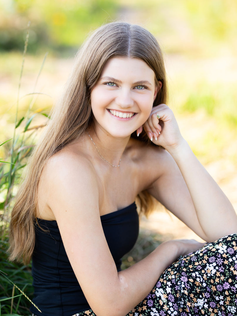 Beautiful outdoor senior picture at Tenney Park in Madison, WI featuring green grass, water, and a natural pose